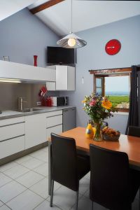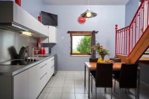 La pièce principale sur un mélange de couleur rouge, noire et grise, elle comprend une cuisine aménagée avec réfrigérateur, plaques de cuisson, four micro-onde, cafetière «Senseo», grille-pain et ensemble des ustensiles à cuisine. A cela s’ajoute un fer à repasser, une planche à repasser. La cuisine comprend aussi une table avec 4 chaises, un canapé convertible de 140 cm et une télévision écran plat.