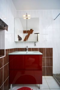 En allant sur la mezzanine vous ne pourrez pas passer à côté de cette rambarde en fer forgé repeinte en rouge pour se marier avec le moderne du lieu. Sur cette mezzanine, un lit de 160 cm ainsi qu’une table de chevet, une lampe et une penderie.