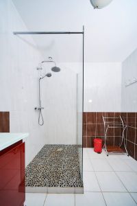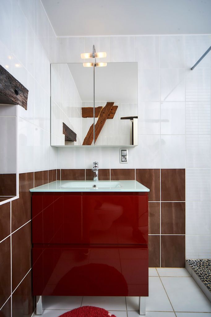 En empruntant l’escalier en bois, vous arriverez à demi étage à la salle de bain de couleur chocolat avec une douche à l’italienne, WC, un lavabo et des rangements.