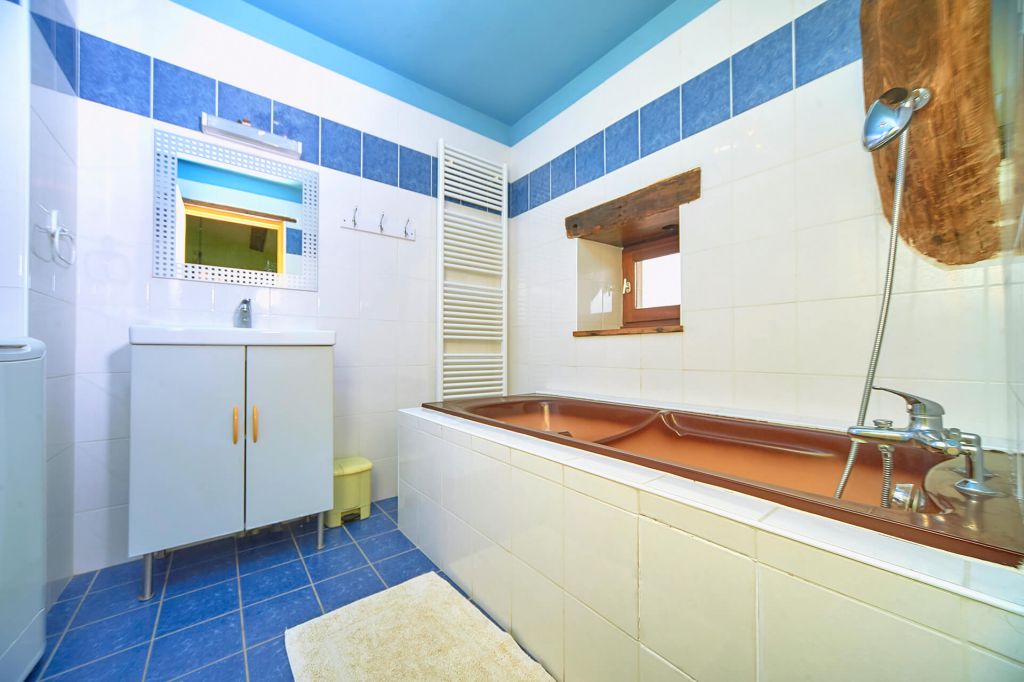 À demi-étage, se situe la salle de bain avec baignoire, WC et lave linge.