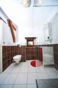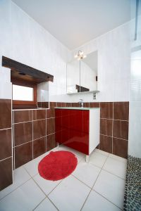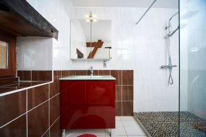 En empruntant l’escalier en bois, vous arriverez à demi étage à la salle de bain de couleur chocolat avec une douche à l’italienne, WC, un lavabo et des rangements.
