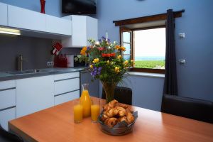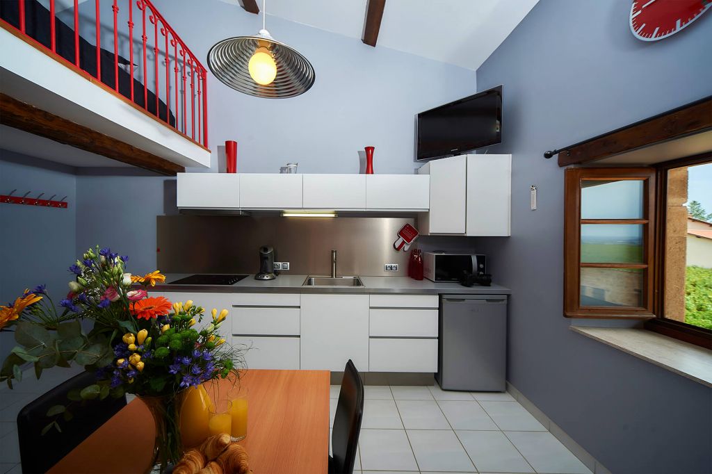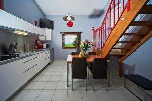 La pièce principale sur un mélange de couleur rouge, noire et grise, elle comprend une cuisine aménagée avec réfrigérateur, plaques de cuisson, four micro-onde, cafetière «Senseo», grille-pain et ensemble des ustensiles à cuisine. A cela s’ajoute un fer à repasser, une planche à repasser. La cuisine comprend aussi une table avec 4 chaises, un canapé convertible de 140 cm et une télévision écran plat.