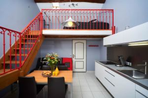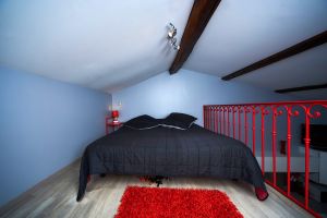En allant sur la mezzanine vous ne pourrez pas passer à côté de cette rambarde en fer forgé repeinte en rouge pour se marier avec le moderne du lieu. Sur cette mezzanine, un lit de 160 cm ainsi qu’une table de chevet, une lampe et une penderie.