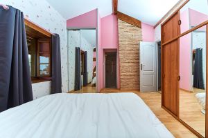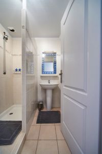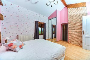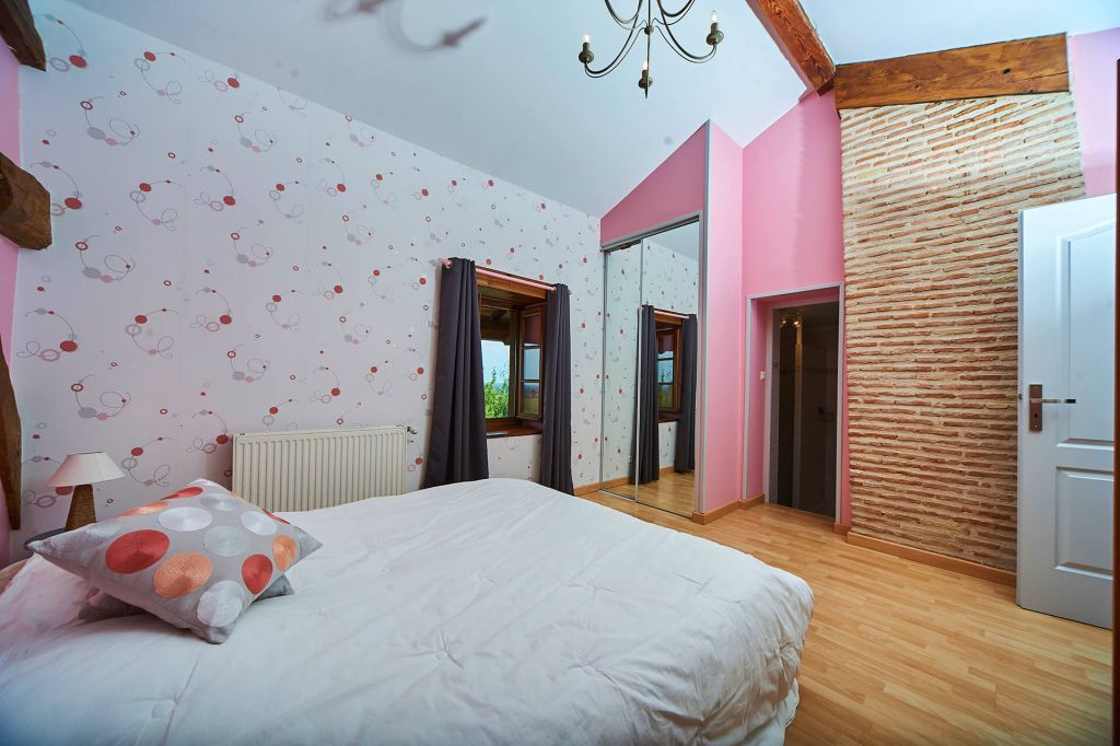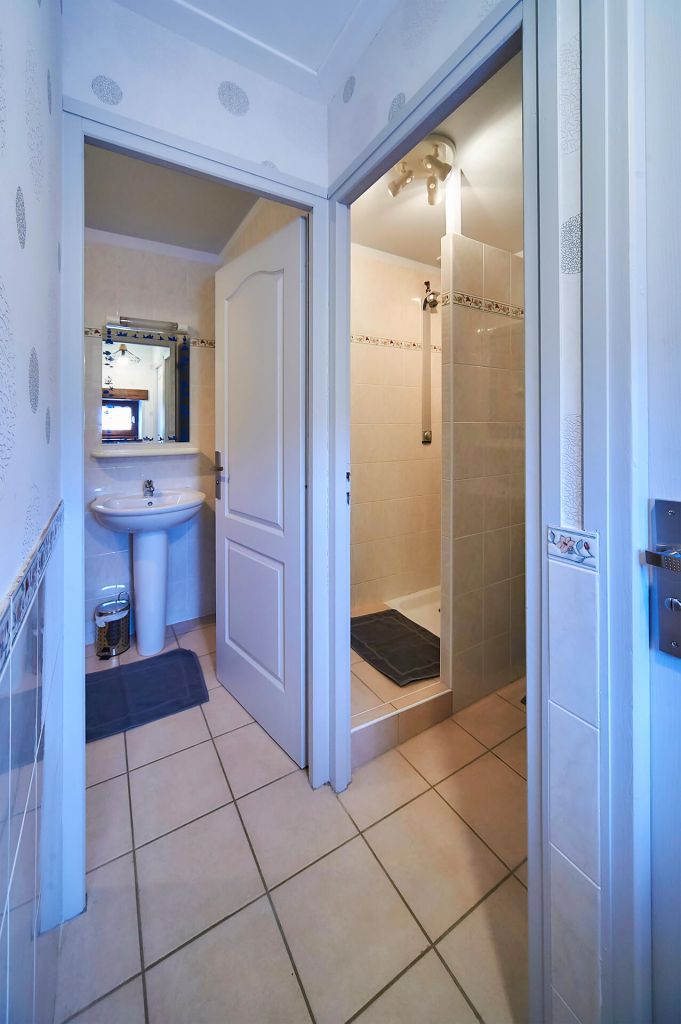 La seconde chambre de couleur saumon avec un lit de 160 cm et une penderie. Elle communique directement avec une salle de bain avec douche et WC, le tout entièrement réservé pour cette chambre.