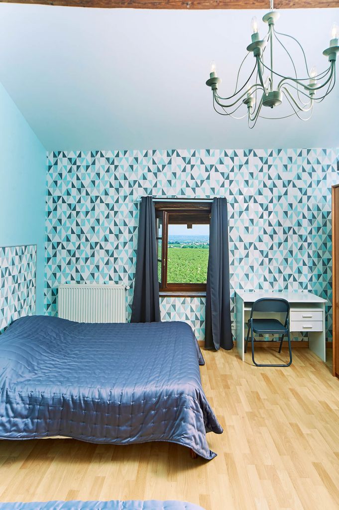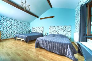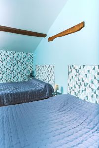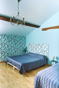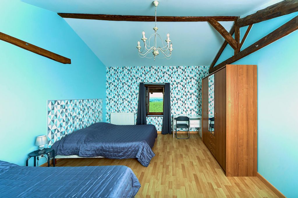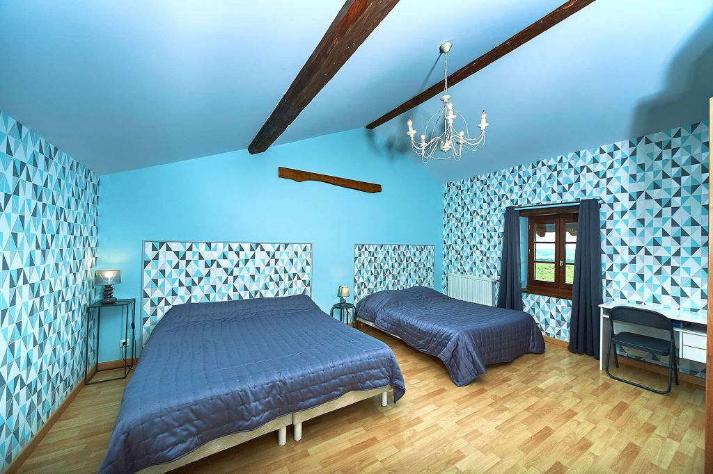 La première de couleur bleue, est une chambre familiale où se trouve deux grands lits de 160 cm, un lit bébé, une penderie et un bureau. Cette chambre possède une charpente apparente.