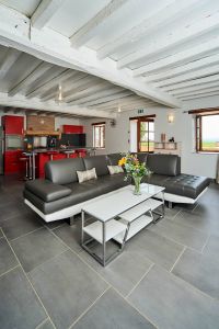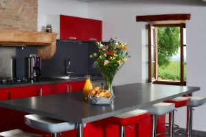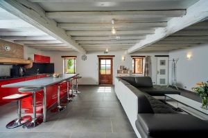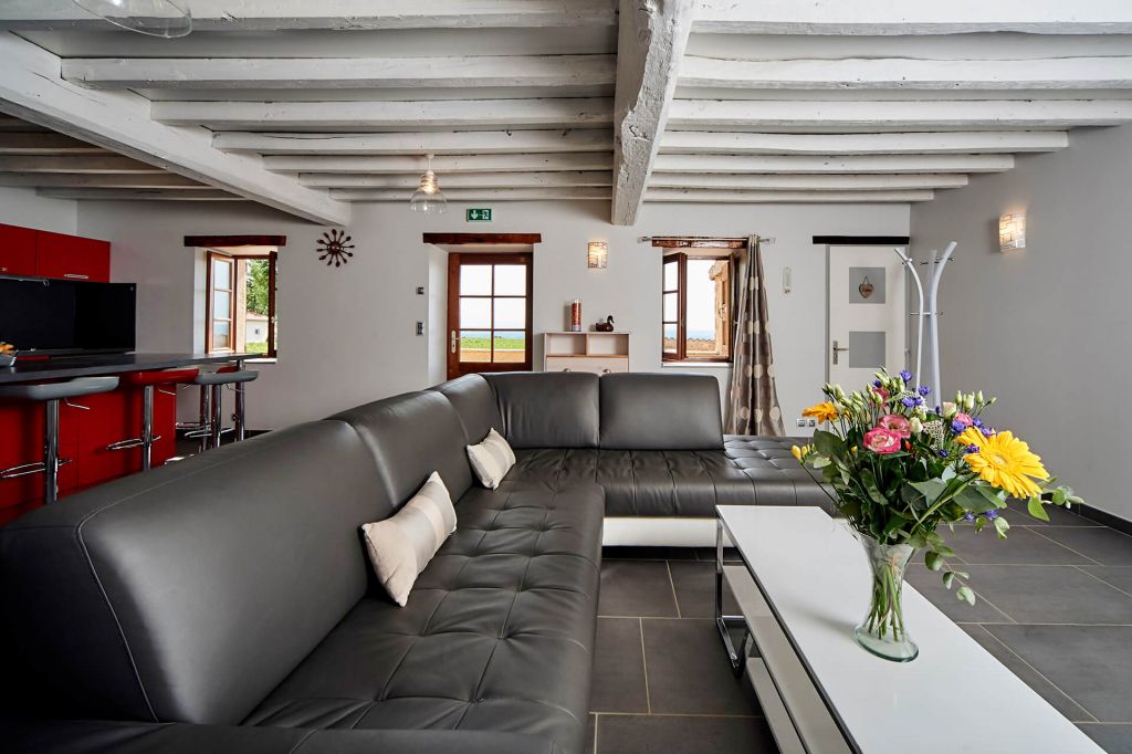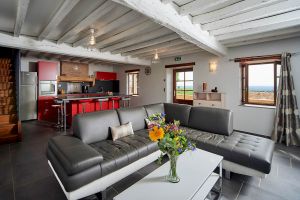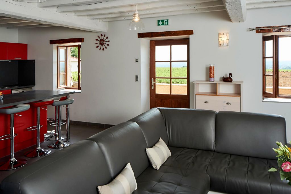 Le gîte de 8 personnes « Le Gamay », cépage du Beaujolais, retrouve ses couleurs rouges à travers une cuisine américaine ouvrant sur un salon. Ce gîte est un mélange entre l’authentique des poutres apparentes, de la cheminée d’origine et le moderne de l’aménagement, le tout créant une harmonie à l’image de la région.
