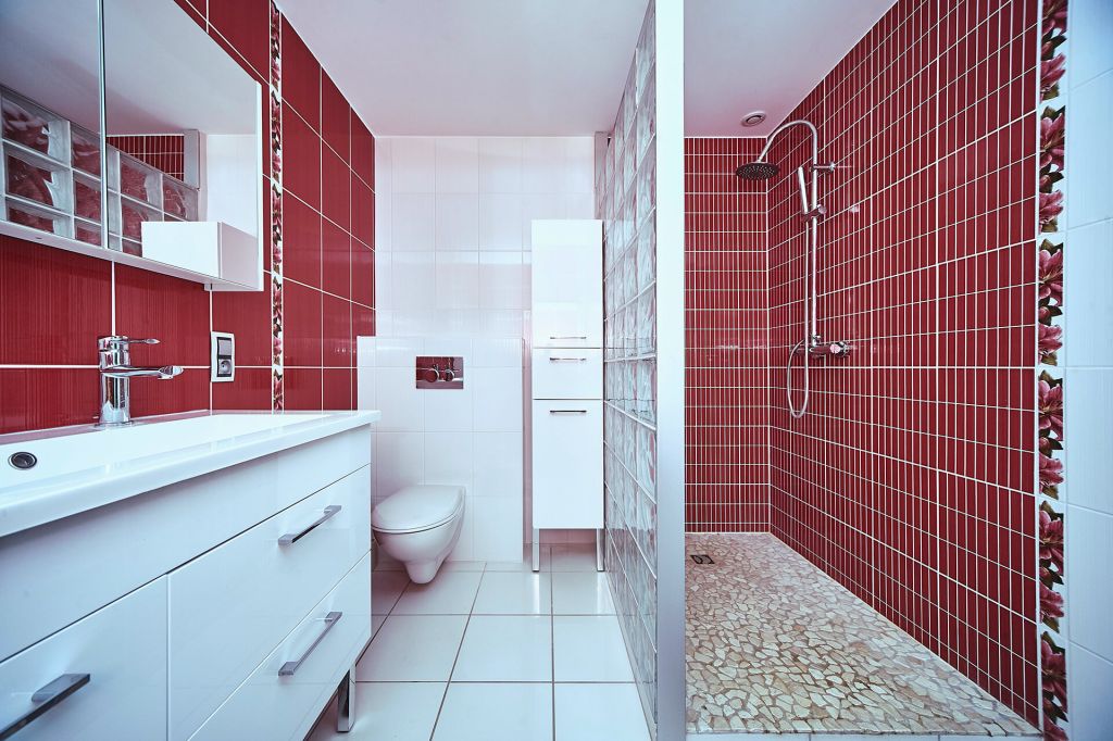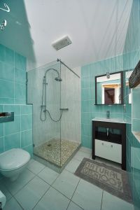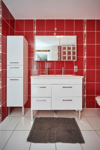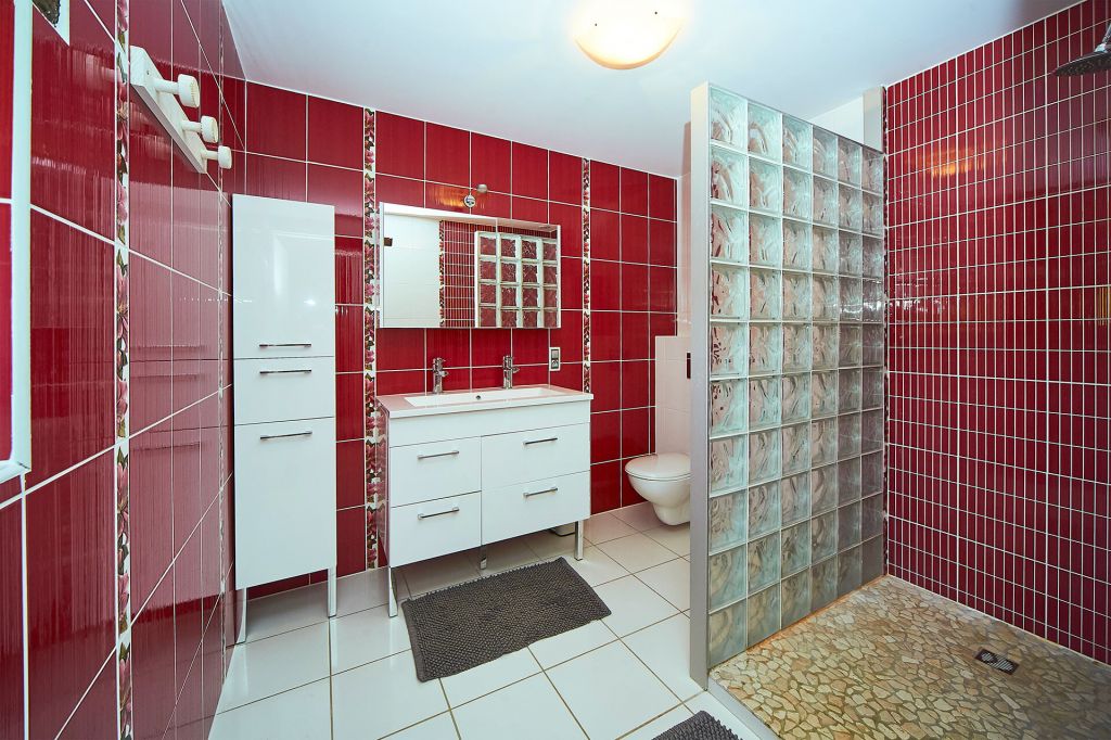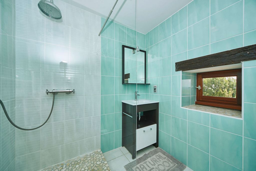 Sur ce même étage, se trouve une grande salle de bain avec une douche à l’italienne, d’un WC, de deux vasques et de rangements.