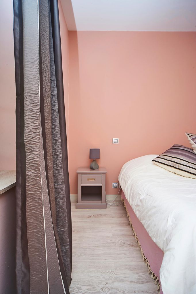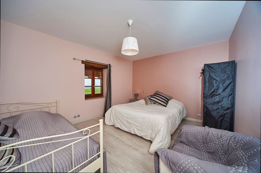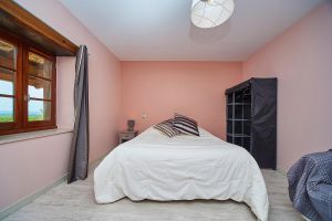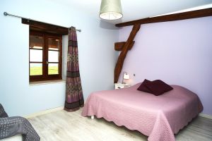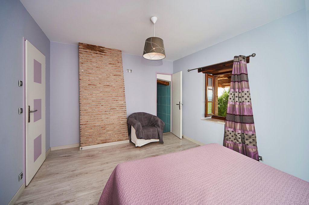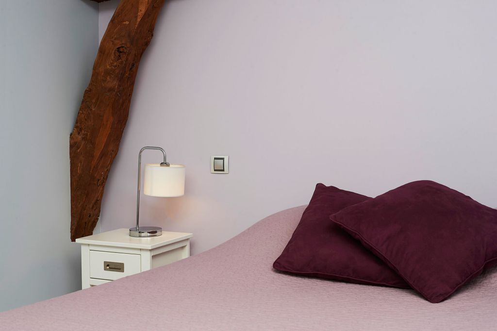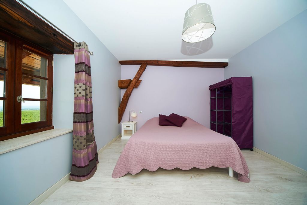 À l’étage vous trouverez une première chambre composée d’un lit de 160 cm, d’une table de chevet avec lampe et d’une penderie. Ses couleurs mauves à l’image du vin, se marient avec le bois de la charpente et la cheminée aux briques ressortant. A cette chambre est directement liée une salle de bain avec douche à l’italienne avec un part terre de cailloux, un WC ainsi que des rangements.