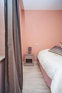 Une deuxième chambre avec un lit de 160 cm et un lit de 90 cm, est aménagée avec une penderie, une table de chevet et une lampe.