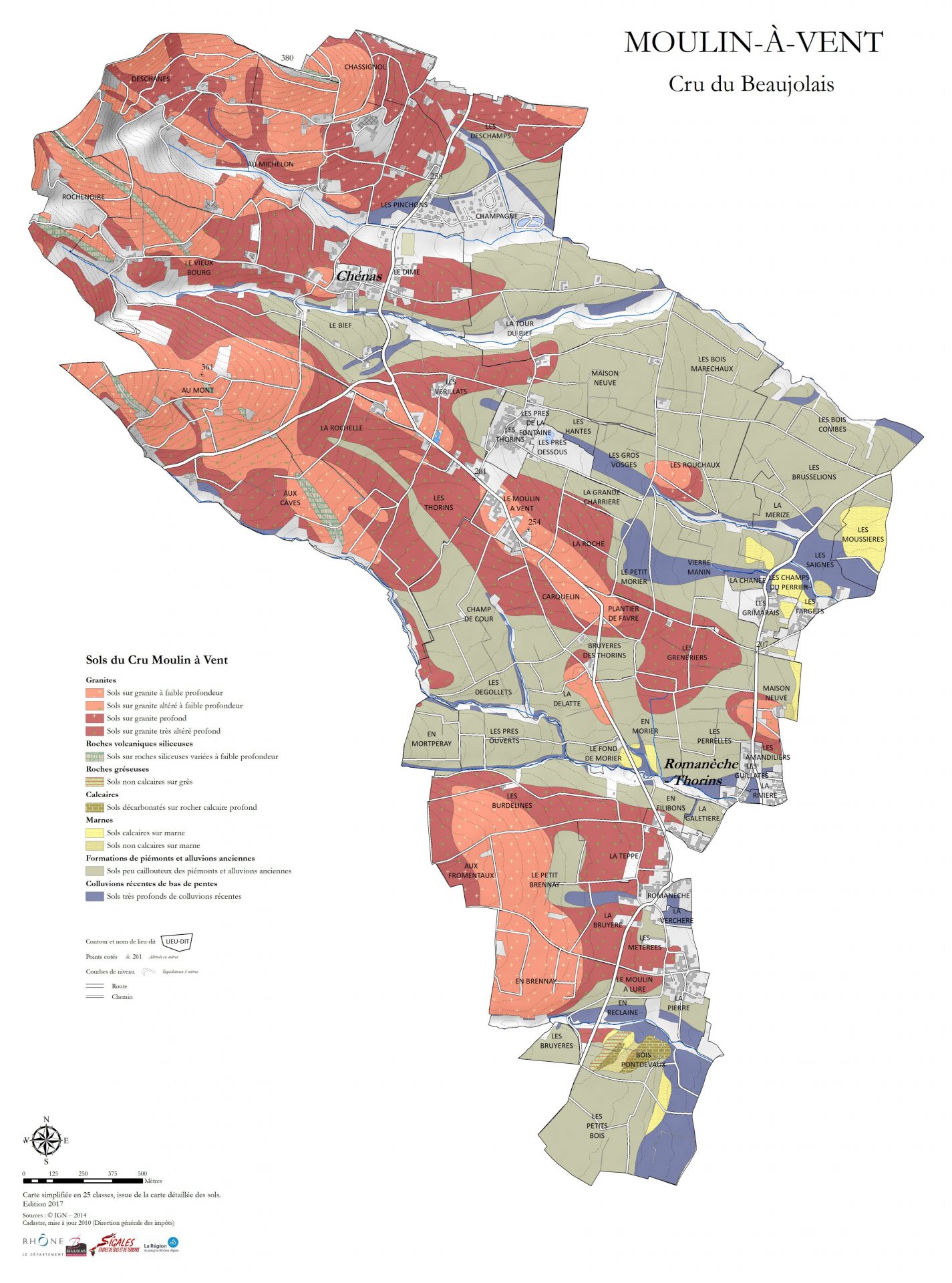 Les vignes de l’appellation Moulin-à-Vent s’étendent sur 640 ha et se situent sur les communes de Romanèche-Thorins (71) et Chénas (69). Les altitudes et pentes moyennes sont parmi les plus modérées des 10 crus. L’appellation Moulin-à-Vent est partagée entre une majorité de versants granitiques plus ou moins rocheux et des piémonts plus argileux, avec de grandes plages de transition entre les deux. Toute la bordure Ouest du cru et plus particulièrement les hauts versants, sont dominés par le granite rose-rouge à gros cristaux.